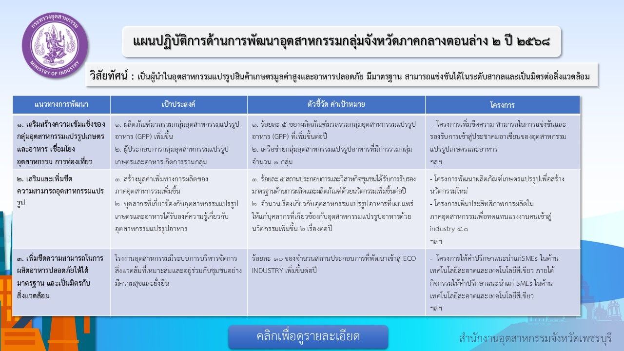 | แผนปฏิบัติการด้านการพัฒนาอุตสาหกรรมจังหวัดเพชรบุรี รายปี พ.ศ. 2568  | แผนปฏิบัติการด้านการพัฒนาอุตสาหกรรมกลุ่มจังหวัดภาคกลางตอนล่าง 2 พ.ศ. 2568